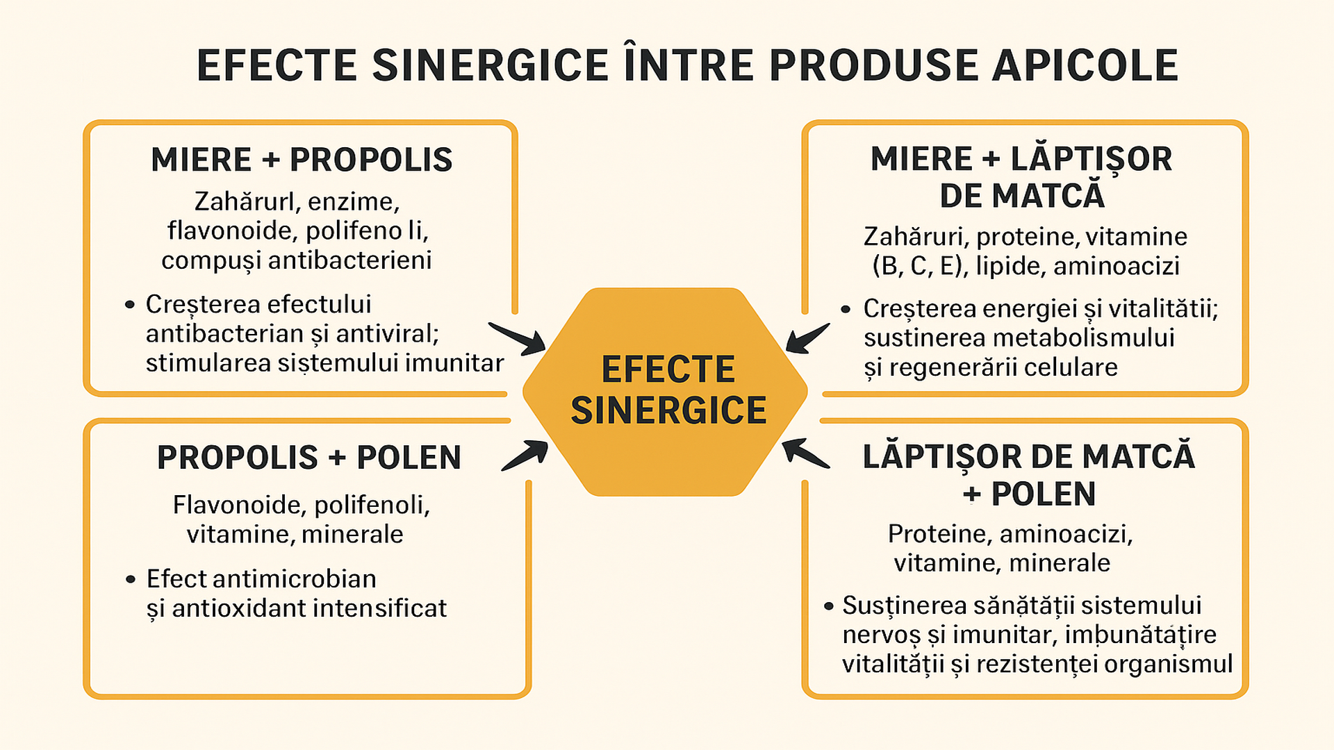 Totuși, am păstrat claritatea și accesibilitatea informației, astfel încât să poți înțelege cât mai bine interacțiunile benefice dintre diferitele produse apicole și modul în care acestea acționează.